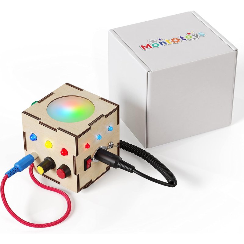 Montessori Busy Board Fidget Cube for Toddlers {Improved 2023 Version} Wooden Sensory Activity Cube Toys for Toddlers LED Light Up Buttons Pluggable Wires Baby Gifts Educational Learning Fidget Toy