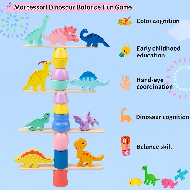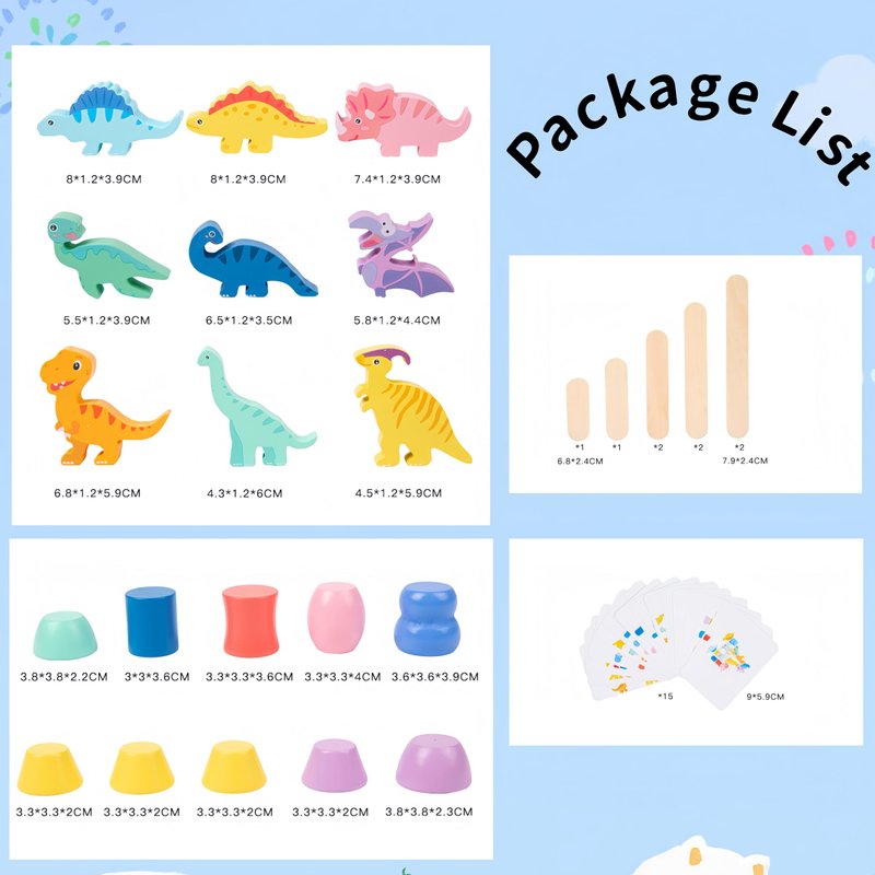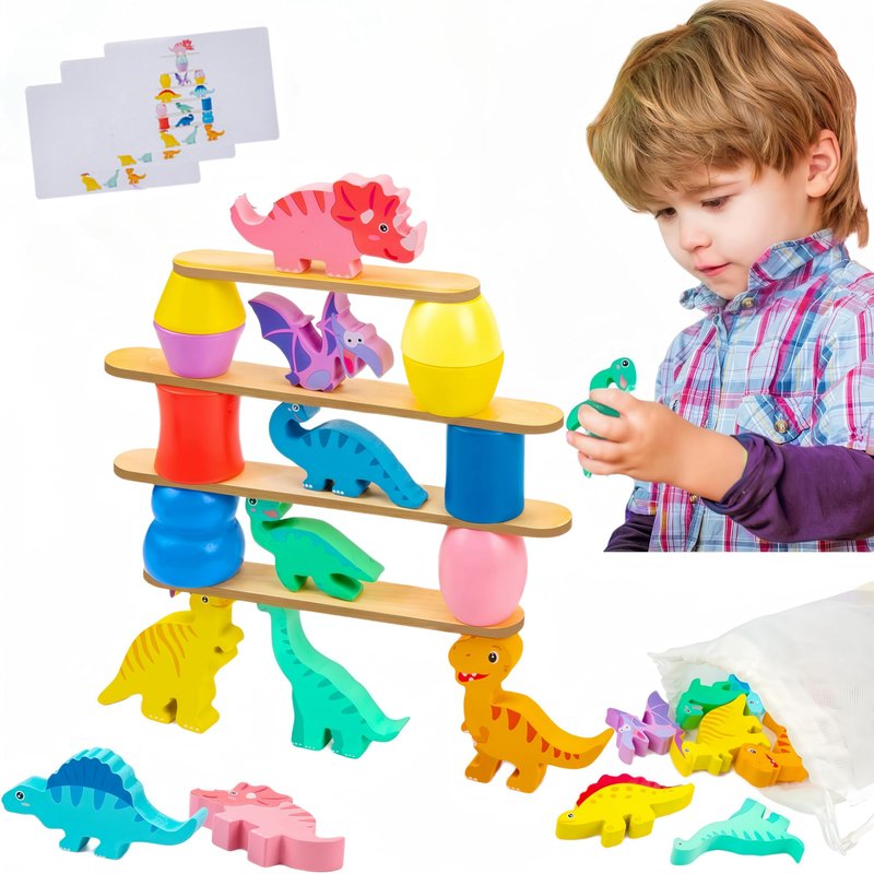 - Stacking and Balancing Dinosaur Toys: This toy set is a hands-on activity designed for stacking, sorting, and balancing. It includes 9 colorful dinosaur blocks, 10 geometric blocks, 10 wooden planks, and 15 double-sided challenge cards. Children are capable of exploring spatial awareness, hand-eye coordination, fine motor skills and creative problem-solving through stacking challenges.