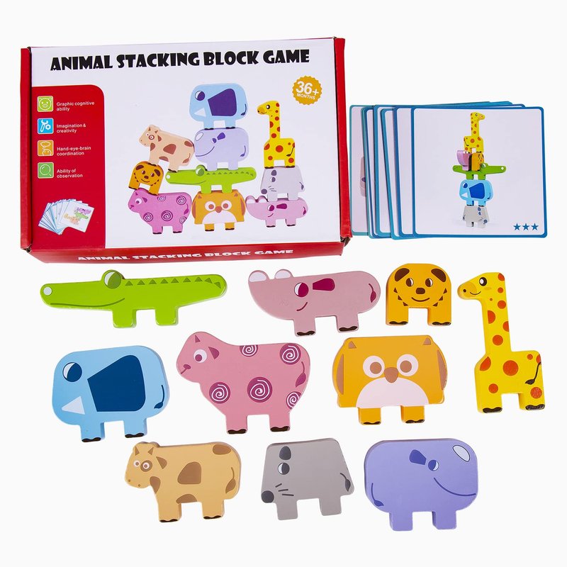- 【Wooden Animals Stacking Toys】 This stacking block toy includes 10 chunky blocks: giraffe, sheep, dog,owl,cows,crocodile,hippo,elephant,mouse,rhino and 10 double-sided challenge cards with three different levels of real challenge. The cute wooden stacking blocks designed with a cute & realistic appearance are not only toys but also early childhood education products.