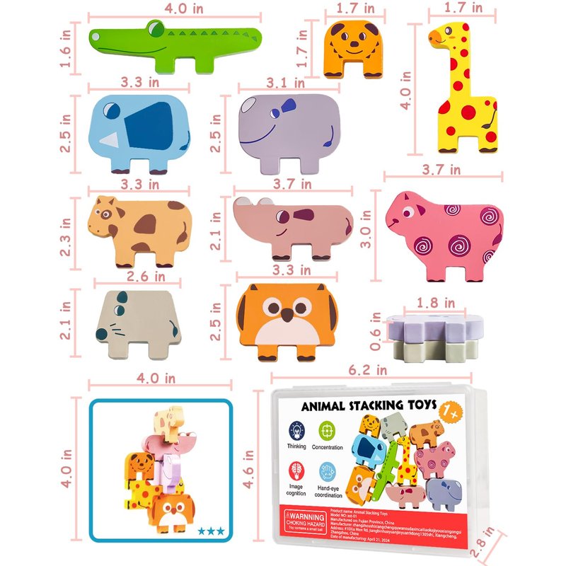 - 【Montessori Toys for Kids】This wooden sorting & stacking toy contains 10 differentshapes of blocks. These blocks have simple lines to outline different animals: giraffe, sheep, puppy, cow, crocodile, hippo, elephant, mouse and rhino. When babies try to match the blocks to the target or make various combinations, they can also get so much pleasure. It includes 10 double-sided challenge cards with three different levels of real challenge.
