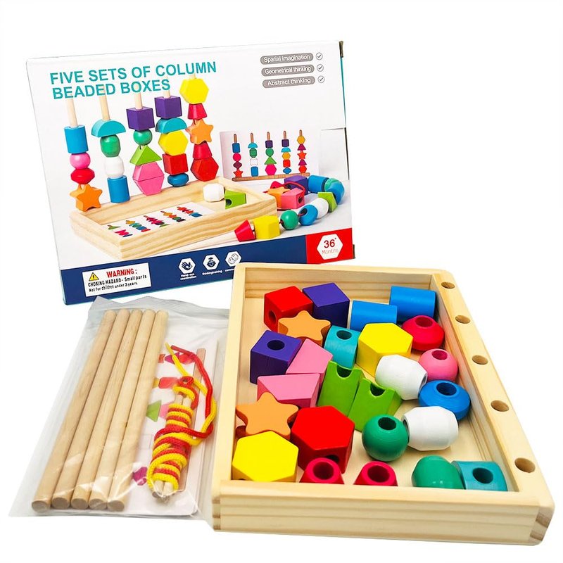 - 🌈BRIGHTLY COLORED WOODEN TOYS: Our wooden toys comes with 25 colorful wooden beads with various shapes, 1 wooden stand, 2 laces with wooden stick, 8 double-sided pattern cards, and a wooden storage case. Our wooden bead play set includes beads in 11 distinct shapes that are easy for little hands to grasp. The laces are thin enough to allow the beads to fit seamlessly.