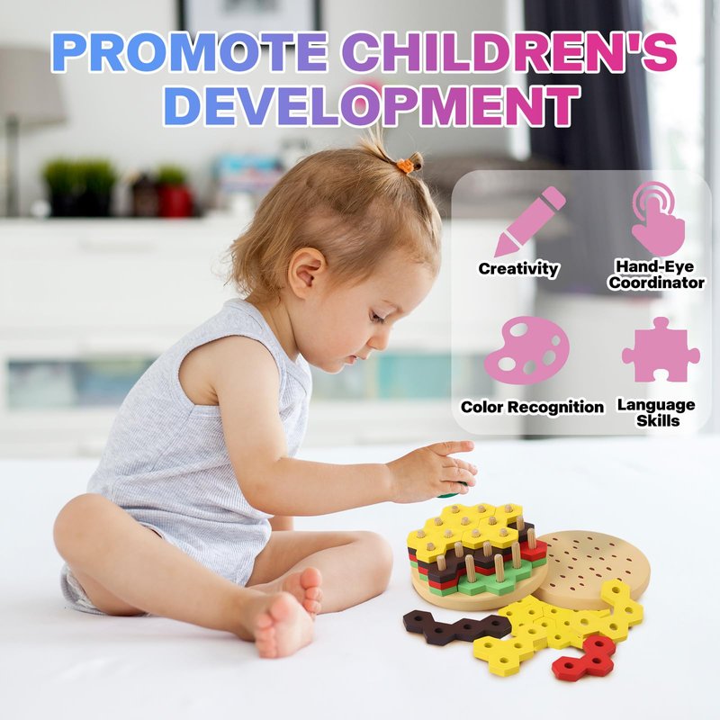 Montessori wood stacking burger provides unlimited entertainment and fun for children 3-7 years old, and can also promote the baby's color and shape cognitive development, and improve the baby's hand-eye coordination ability.