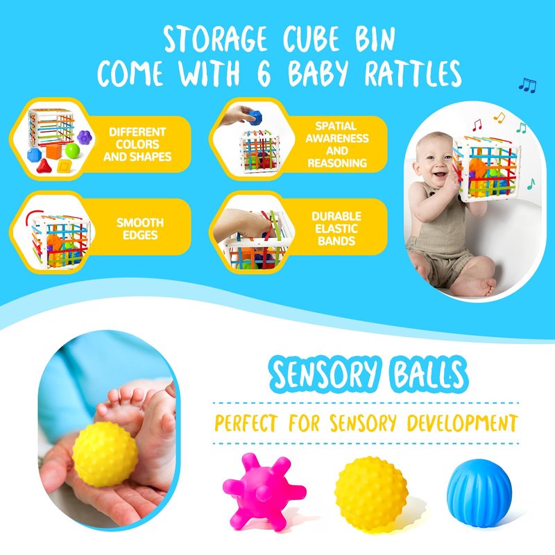 - 6 IN 1 MONTESSORI BABY TOYS - Give your baby the best start in life with our specially designed infant toys set. Everything your baby needs for a well-rounded play and learning experience. Our sensory toys set contains the baby building blocks x 6, baby stacking cups x 8, sensory balls x 3, suction cup spinner toys x 3, pull string toy x 1, toddler sensory bin x 1, baby rattle toys balls x 6. These newborn toys are designed to be the building blocks of a bright future, one playtime at a time.