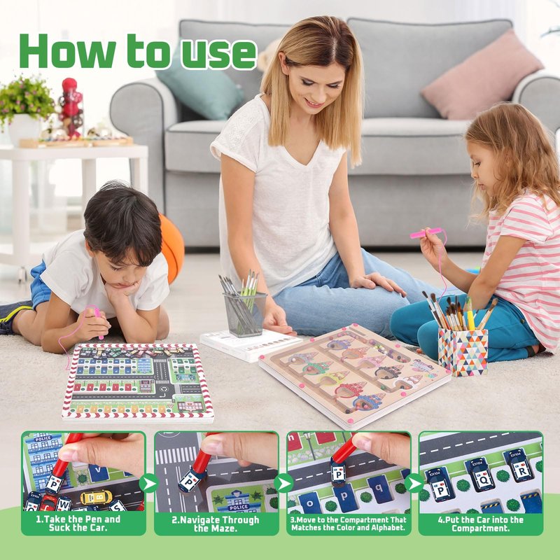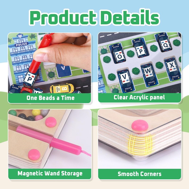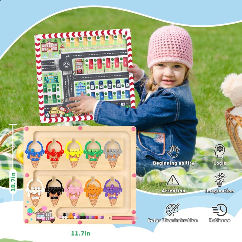 - 【Double Sided Wooden Magnetic Maze Board】Montessori educational board, the car park side can help kids identify 26 letters of the alphabet and work on concentration and hand-eye coordination. The ice-cream side develops colour matching and counting skills as well as patience and concentration.