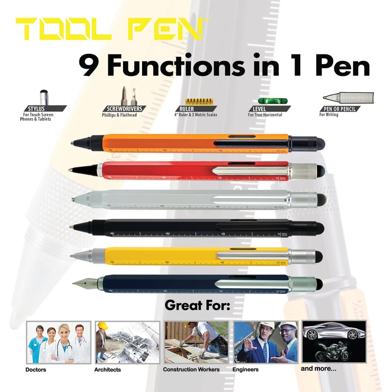 - Multifunctional Design: The pen features nine essential tools, including a stylus, Phillips and flat-head screwdrivers, a built-in level, ruler, and more, all housed in a vibrant blue barrel. The stylus allows for precise navigation on touchscreen devices.