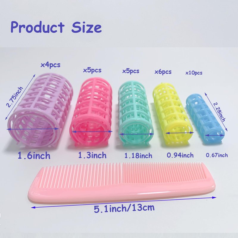 SPECIFICATIONItem: 30PCS Self Grip Hair Curlers SetMaterial: high-quality plasticColor: blue,pink, green, yellow, purplePackage Weight: 90gFEATURES:1. Our self grip hair rollers are made of high-quality plastic, sturdy and durable, friendly to your skin and comfortable to wear, not easy to fade, you can use them with confidence.2.Our hairdressing rollers can fix the hair and curls in place, no need for pins or clips, and the self grip rollers can shape your hair smoothly without indentation.PACKAGE INCLUDED:30PCS Self Grip Small Hair Curlers