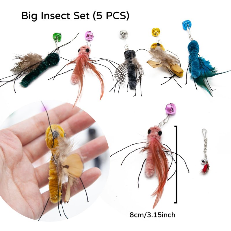 Mooipur Cat Insects Toy Interactive Cat Toy Bug Refills for Cat Wand Toy, 5 Pieces Feather Replacements with Bells for Cat Teaser for Indoor Cats and Kittens, Big Insects Set