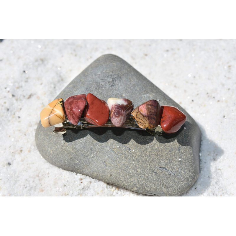 Pretty mookaite jasper stone french barrette, the stones have a gorgeous coloring. The stone french barrettes are adorned with mookaite jasper stones. The mookaite jasper stone hair clip is the perfect accessory for a night out, and can dress up an outfit or be used for a special event, like a quinceanera, first communion, or even a wedding. The hair clip is hand made in the USA and come from a smoke free environment. The mookaite jasper stone hair clip measure: 61 mm x 16 mm x 15 mm or 2.4 inches x .6 inches x .57 inches.