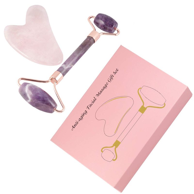 mookaitedecor Amethyst Roller & Rose Quartz Gua Sha Scraping Massage Tool Set, Face Massager for Wrinkles, Anti Aging