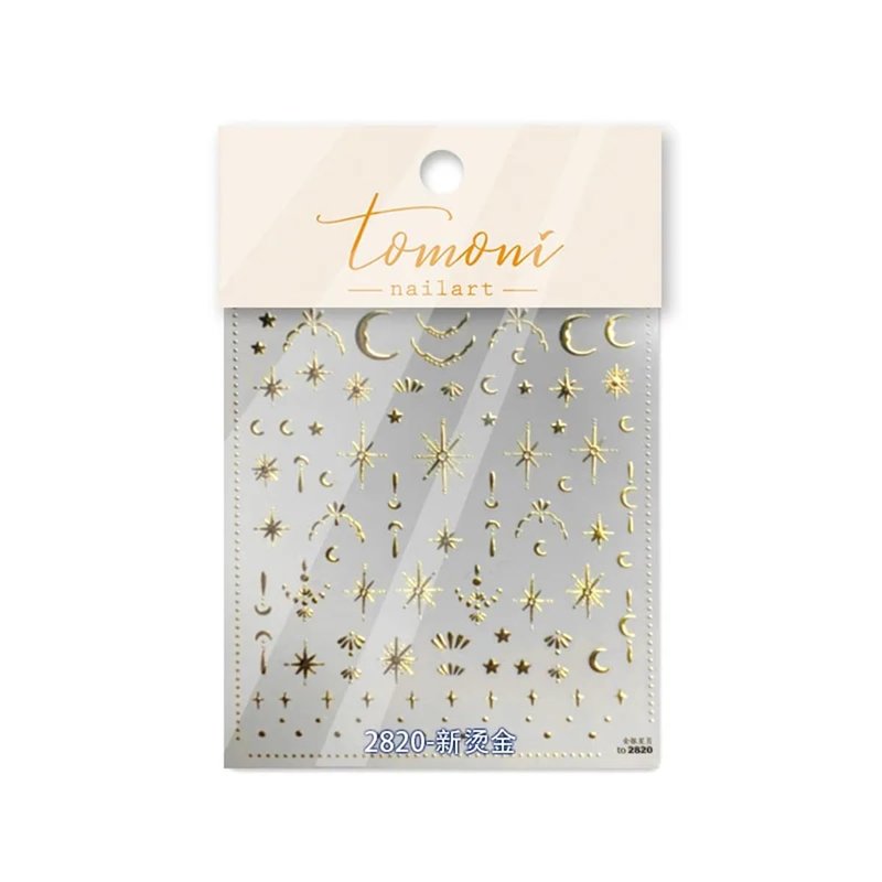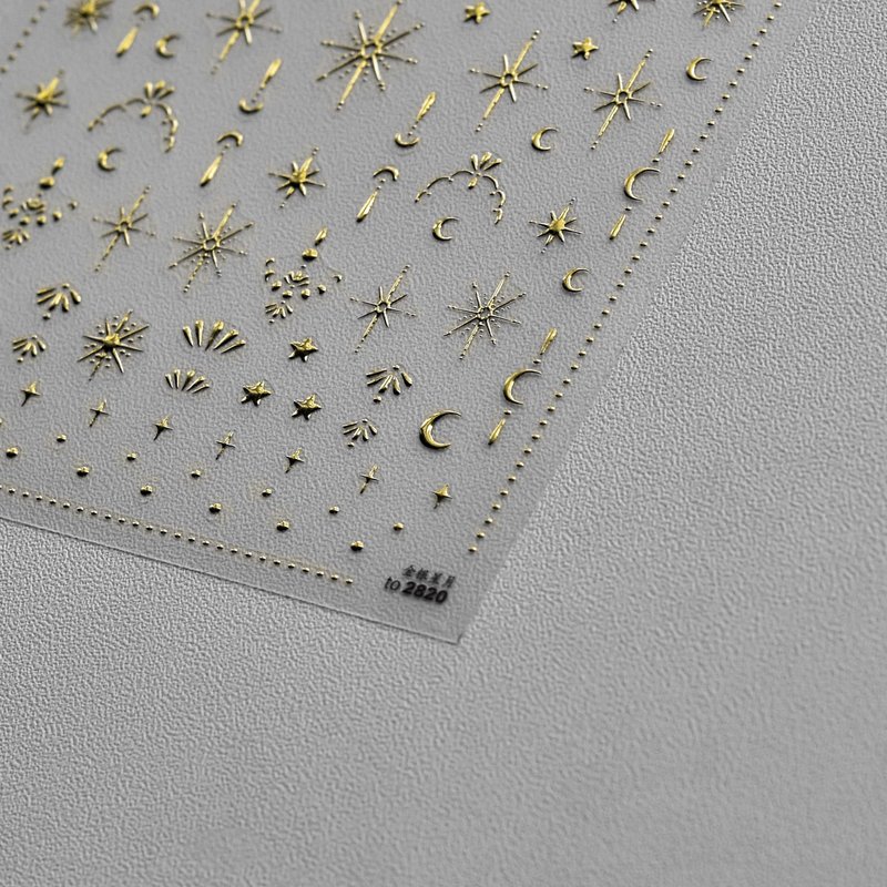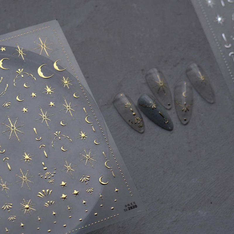 3D Gold Sun/Moon/Star Bronzing Nail Art Sticker 8*10cm Laser Star Moon Design Nail Decal Gold Silver Self-Adhesive Slider Features: Can be used for UV nails. Easy to apply on natural or artificial nails. Great to focus or filling fun in Parent-Child time. Elegant and fashionable style, easy to match any nail color. Very easy to use, suitable for professional salons and home use. Gold star moon design nail decals are very suitable for nails or nail tips. Suitable for most nails. How To Use: 1. Apply your favorite nail polish color as the base color and make it completely dry. 2. Choose the right size and desired pattern, then compare it with nails. 3. Remove the sticker with tweezers, and then press the nail sticker on the nail with a carving pen. 4. Apply a clear top coat and wait for it to dry. 5. When finished, you can design your own patterns and enjoy beautiful nails.