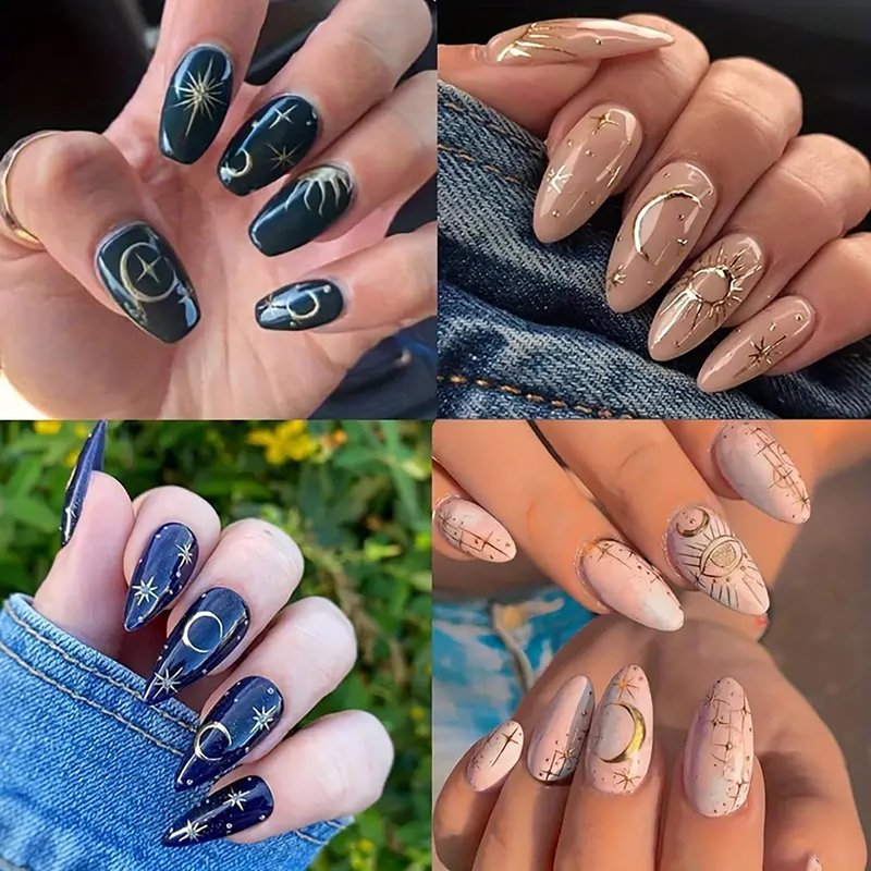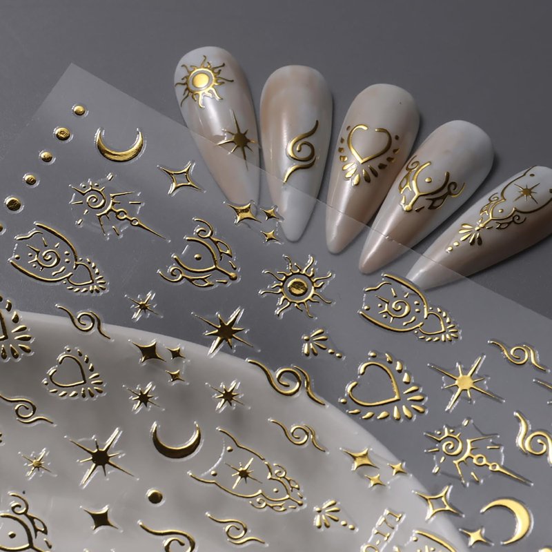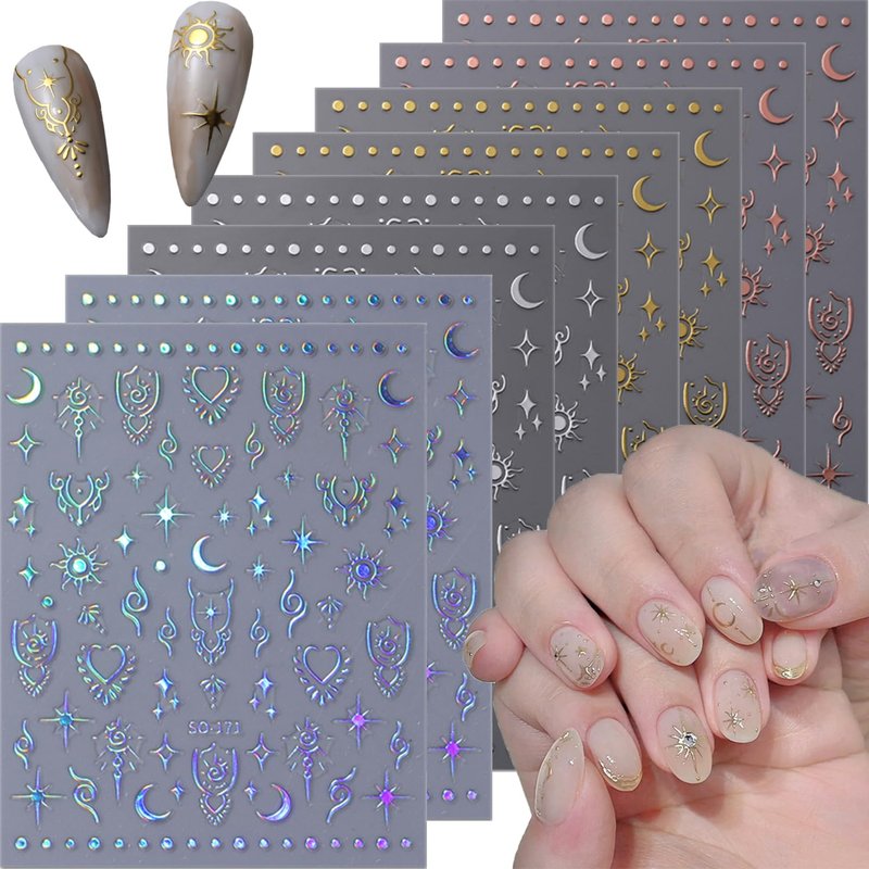 - 【Package】You will get 8 sheets shiny star nail art stickers, stars moon Heart nail designs decoration, can add a strong fashion atmosphere. Perfect for women girls, exquisite nail design, DIY fashion nail decoration.