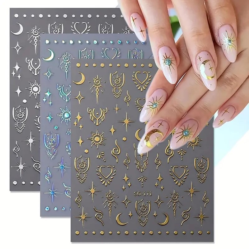 Moon Star Nail Stickers 8 Sheets 3D Nail Art Stickers Self-Adhesive Metallic Nail Decals Shiny Laser Nail Designs Gold Silver Nail Supplies Sun Moon Heart Nail Accessories for Women Nail Decorations