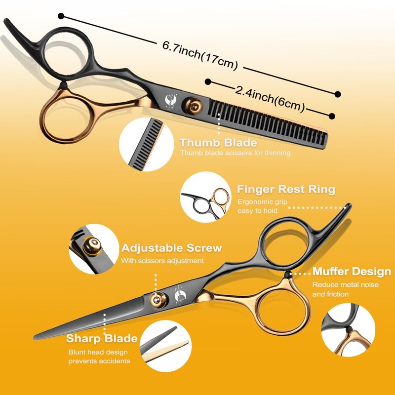 - Complete Set: The Hair Cutting Scissors kit includes 9 essential tools: hair cutting scissors, thinning shears, a comb, a cleaning cloth, and more, providing everything you need for a complete hair cutting experience
