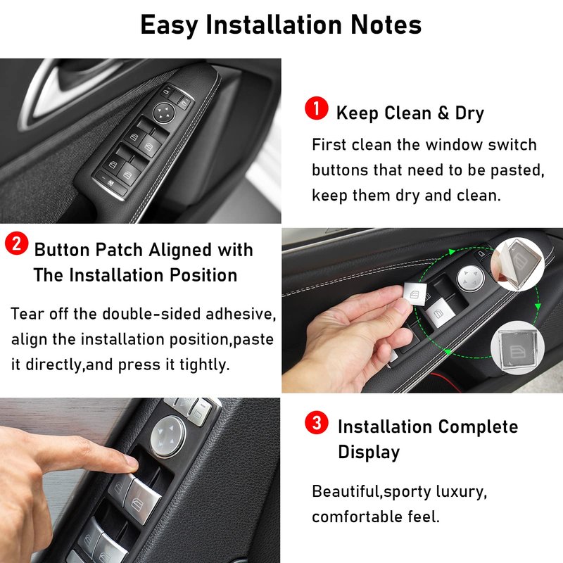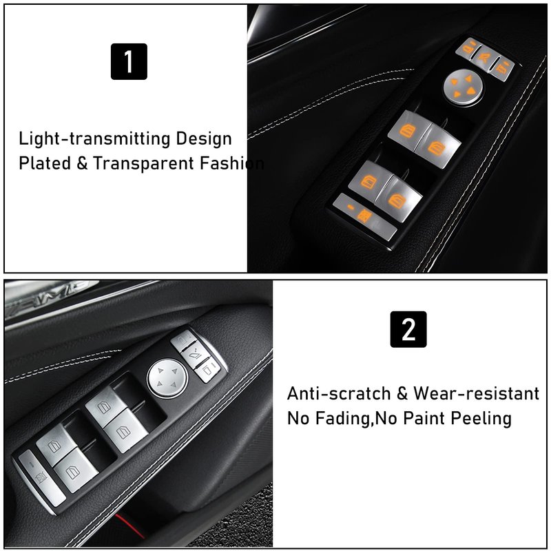 - đăUpgrade-Decoration and ProtectionăThe original buttons are easy scratched after long-term use.Moonlinks Window Switch Button Decorative Sticker can protect the original buttons perfectly.Compatible with Mercedes-Benz Class C W204 2008-2015,Class E W212 2010-2015,CLA Class C117 2013-2019 window button stickers that keep your vehicle unique and eye-catching,Instant upgrade the appearance.Freshen up the interior for your C Class Window Button with this chrome-plating window button stickers.