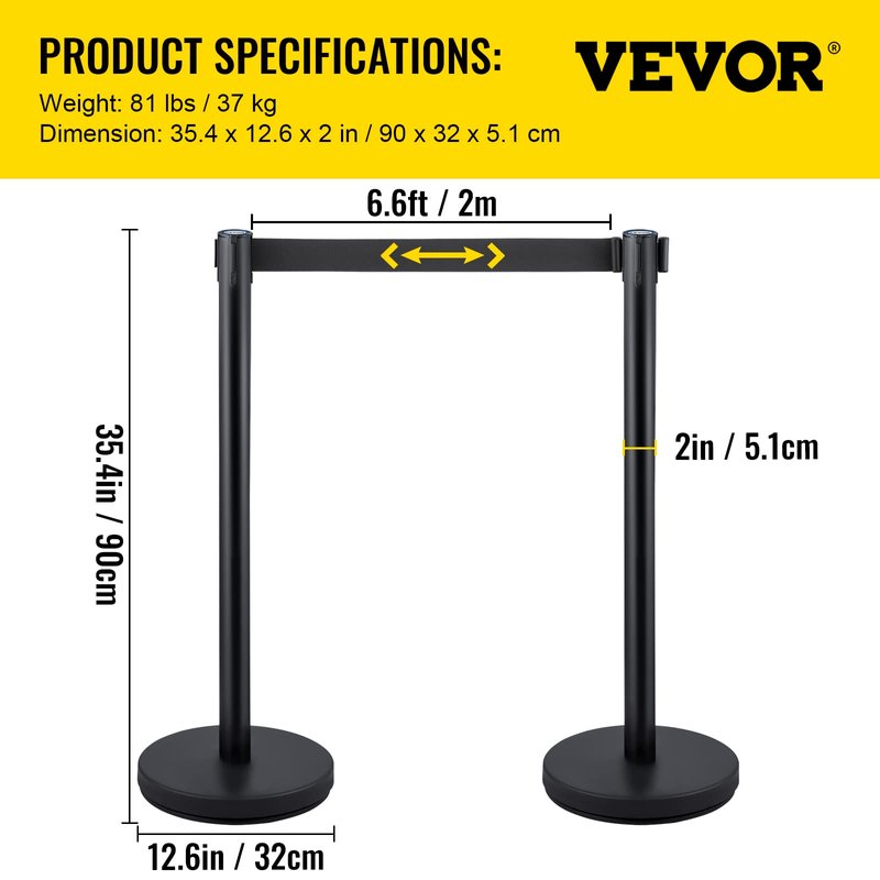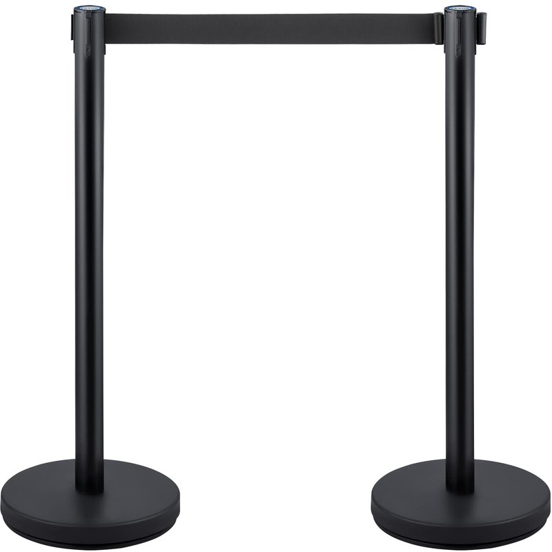 6 PACK Black Velvet Belt Stanchion Queue Posts 36In Height Queue ControlQueue post is designed to help get people in order. Using at stations or airports, queue poles can make waiting lines orderly; at banks or hotels, they can separate different servicing windows for high efficiency; and at auditoriums or exhibition centers, they can divide areas into various parts for different functions. Shinny and modern design make it suitable for various occasions, like theaters, hotels, casinos, restaurants, film festivals, museums, red carpet events and more. FeaturesEach post comes with its own belt assembly.Made of premium stainless steel with baking finish, elegant, durable and not easy to be scratchedBlack polyester belt is durable and wear resistantRubber at the bottom of each base can protect the floor from scratching and increase the the friction between the pole and floor, making the poles more stableLength of the whole black belt up to 2m, visible length is 1.8m. 32cm base filling with sand is strong enough to against the wind and not easy to be pushed down by the crowd.One queue post only takes you about one minute to be set upEach unit comes with three clips and one retractable belt, allowing you to combine poles freely according to your own needs Products SpecificationMaterial: stainless steel, polyester BeltColor: Black UnitHeight: 90cm/35.4inPole Diameter: 63mm/2.5inBase Diameter: 320mm/12.6inBase Weight: 5kg/11lbUnit Weight: 6kg/13lbWhole Length of Belt: 2m/6.5ftVisible Length of Belt: 1.8m/6ftBelt Width: 48mm/2inPackage Content: 6 pcs Stanchion Queue Post