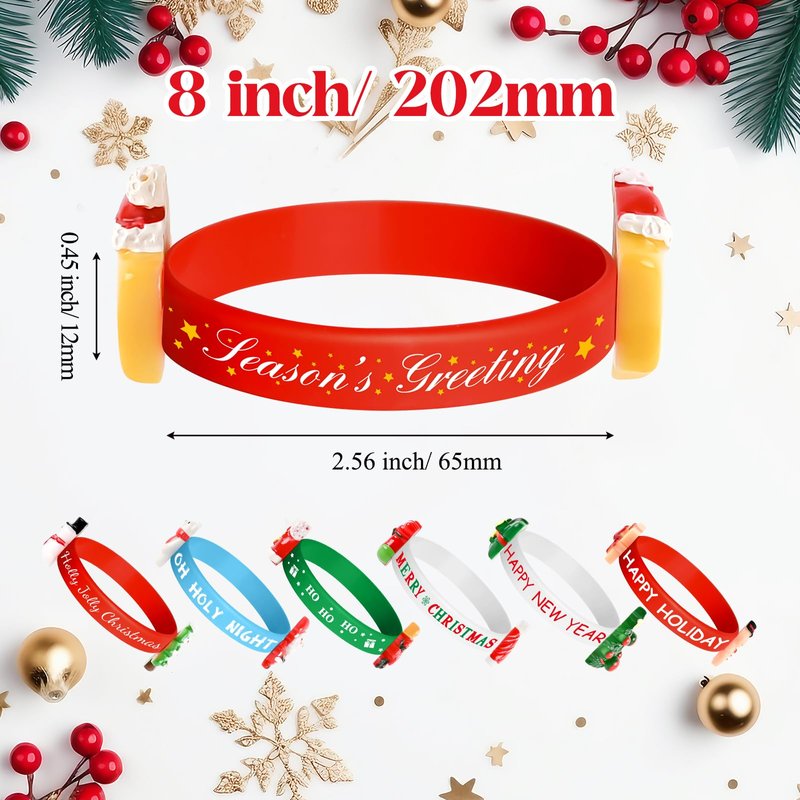 Specifications: Material: silicone, resin Color: as picture shown Size of wristbands: about 2.6 inches (diameter) Design: 10 different styles Package includes: 10/20 x Merry-Xmas wristbands Notes: Manual measurement, please allow slight errors in size. The color may exist a slight difference due to different screen displays.