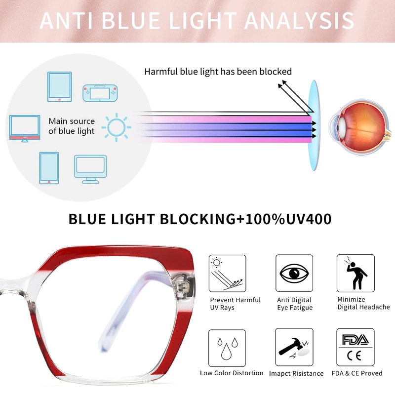 - HEALTHY FUNCTION-Blue light makes our eyes feel dry or painful when we working, driving,gaming,reading or using computers, phones and TV. A single pair of blue light blocking lens glasses with UV400 protection can fix that. Also the original clear lenses can be replaced with your prescription lenses in optical store.