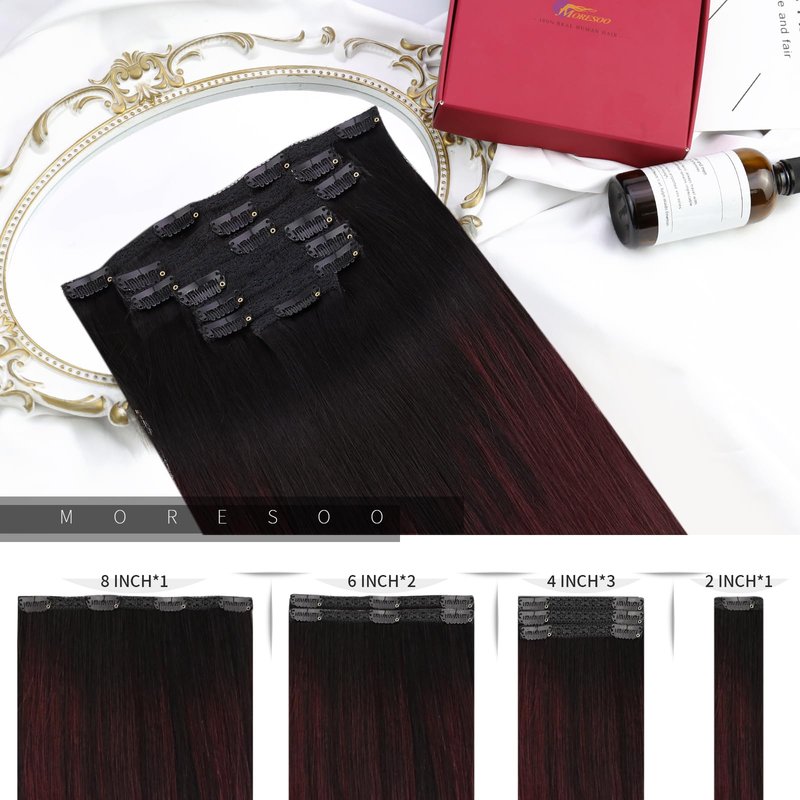 Moresoo Balayage Clip in Hair Extensions Black to Wine Red Hair Extensions Clip ins Real Human Hair Ombre Black to Burgundy Clip in Human Hair Extensions Full Head 16inch 7pcs/120g