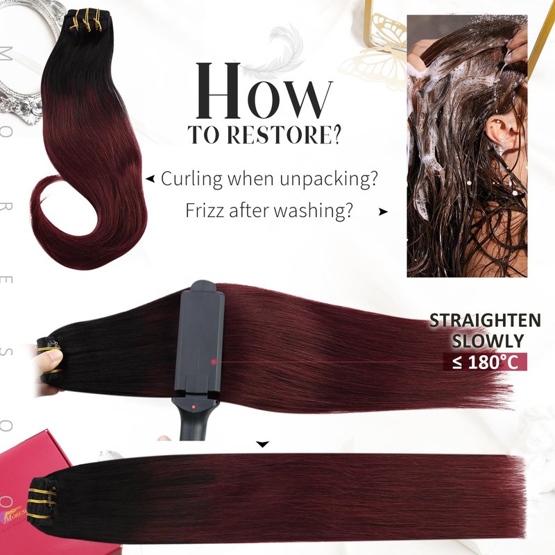 - ღ。【Service & Tips】 Moresoo human hair clip in extensions is silky,shiny and smooth, still perform well after washing and styling. When you curl or straighten it, please control the temperature under 250F. Regarding the clips, if it is damaged during use, we can provide free replacement clips for life.