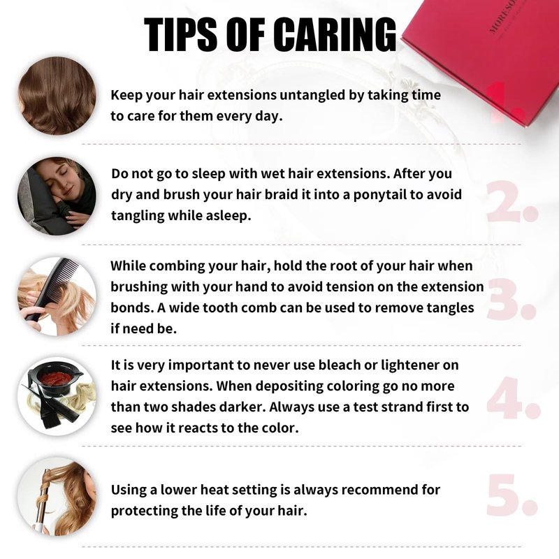 - 【About Caring】Please use mild shampoo to wash your hair and let the hair dry naturally. Since hair extensions cannot draw the nutrients as our own hair, apply the conditioner on your ends will help the hair keep shiny and silky.