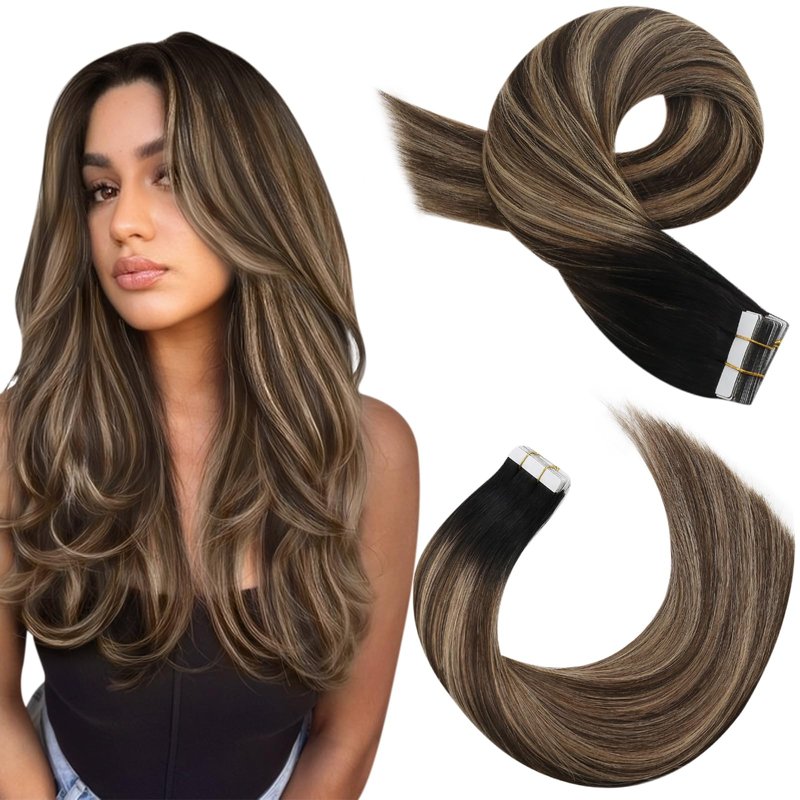 Moresoo Tape in Extensions Ombre Black Hair Extensions Tape in Balayage Off Black to Blonde Mix with Brown Tape in Human Hair Extensions Remy Hair Tape in Extensions 14 Inch #1B/4/14 20pcs 50g