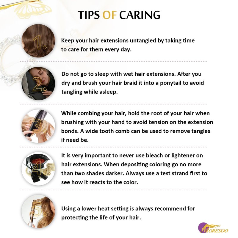 - About Styling: Moresoo Hair Extensions Support Straightening and Curling; The Temperature is Controlled Below 180°C; When Styling a Single Piece, The Temperature Shouldn't Exceed 150°C, Too High a Temperature May Cause Discoloration