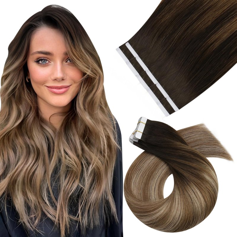 Moresoo Tape in Hair Extensions Human Hair,16 Inch 10 Pcs 25 Gram,#4/10/16 Brown to Gold Brown with Golden Blonde, Seamless Hair Extensions Fashion