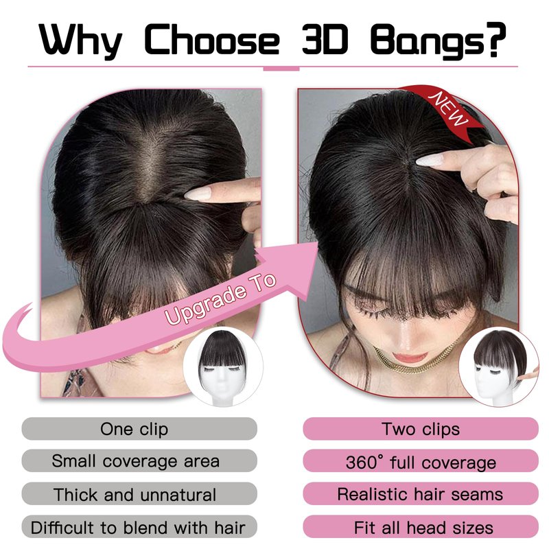 - 🌹【Newly Upgraded 3D Bangs Design】:This 360° hair bangs adopt the latest design:a one-piece hairpiece design (bangs with topper), can achieve natural connection and blend perfectly with your own hair. Not only can it help you change your hairstyle, but it also solves the problem of hair loss or thinning, increases hair volume, and makes your hair look thick and full. The bangs can also cover white and gray hair, making you look younger without any hurt for your natural hair and scalp.