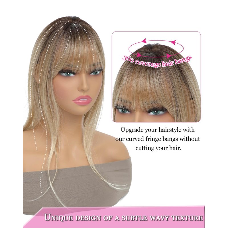 - 【Unique Design】This clip in bangs are designed with a subtle wavy texture that will blend well with your natural hair and frame your face nicely. Upgraded 360°bangs use a mimic scalp with natural hair seams, and no one will guess the key to having wonderful hairstyle.