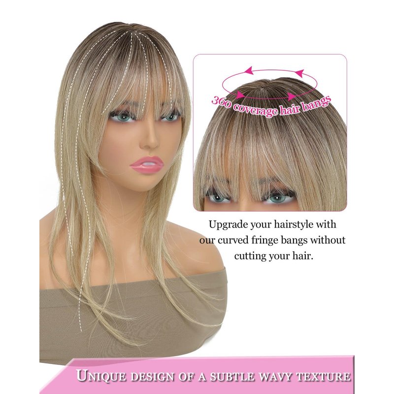 - 【Unique Design】This clip in bangs are designed with a subtle wavy texture that will blend well with your natural hair and frame your face nicely.Upgraded 360°bangs use a mimic scalp with natural hair seams,and no one will guess the key to having wonderful hairstyle.