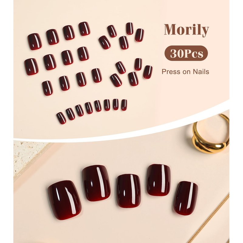Morily 30pcs Press on Nails Short Square Burgundy Fake Nails with Solid Color Designs Acrylic Glossy False Nails Reusable Stick on Nails for Women (Burgundy)