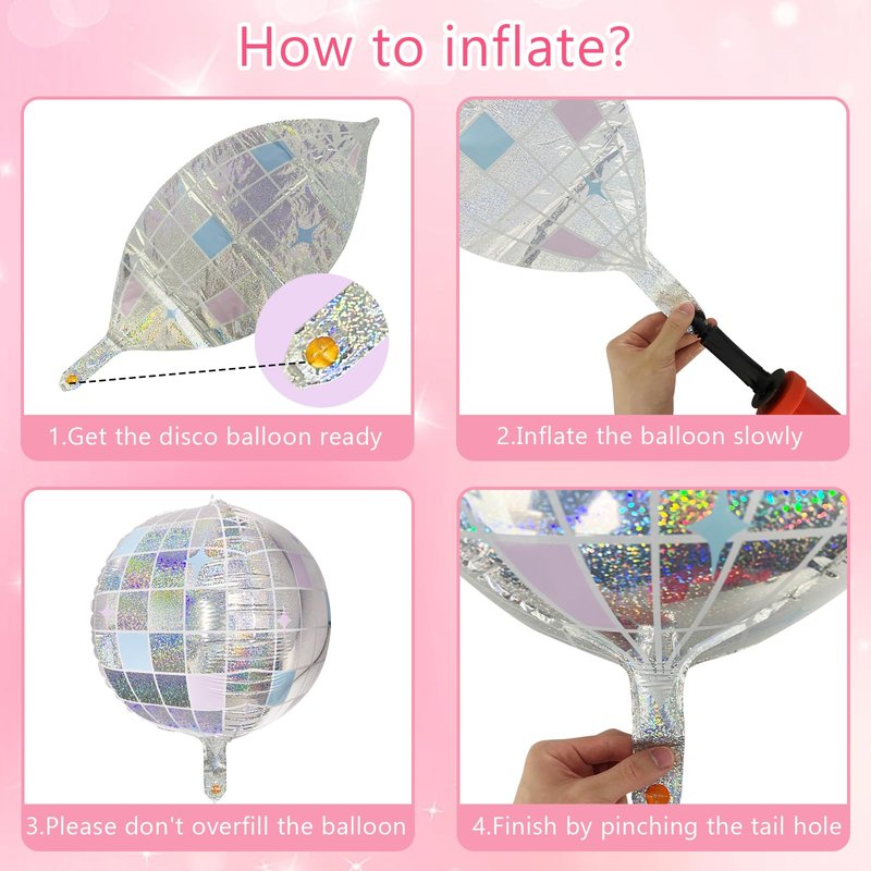- 【Easy to Use】: Shiny disco balloons seal themselves and do not need to be tied. You just need to locate the filling tab, insert the pump or straw and fill the disco balloon with air or helium and you can get a giant 22-inch balloon. Inflated with air disco balloon can not float, but inflated with helium can. There is a little hole on the top of the balloon, offering hangable options. And the disco foil mirror balloon is reusable