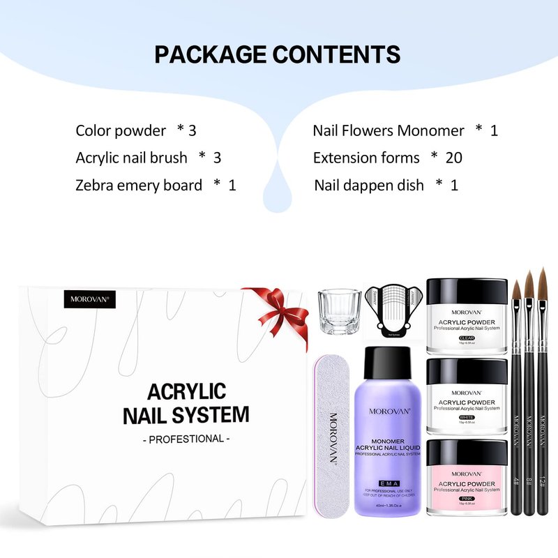 - Morovan Acrylic nail kit: The acrylic powder nail kit starter includes 3 colors acrylic nail powder, monomer acrylic nail liquid, 3 type acrylic nail brushes, nail forms and other basic tool accessories. This easy acrylic powder nail kit is suitable for beginngers DIY at home, and professional salon as well. Make unique nails art with your great imgination.