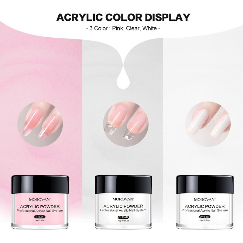 - Healthy & Harmless Acrylic Nail Powder Kit: Morovan 3 colors acrylic nail powder set is made of nontoxic materials, and special protection formula, providing flawless consistency, superior adhesion, self-leveling and bubble-free application, while delivering exceptional strength, durability and natural-looking to nail enhancements.