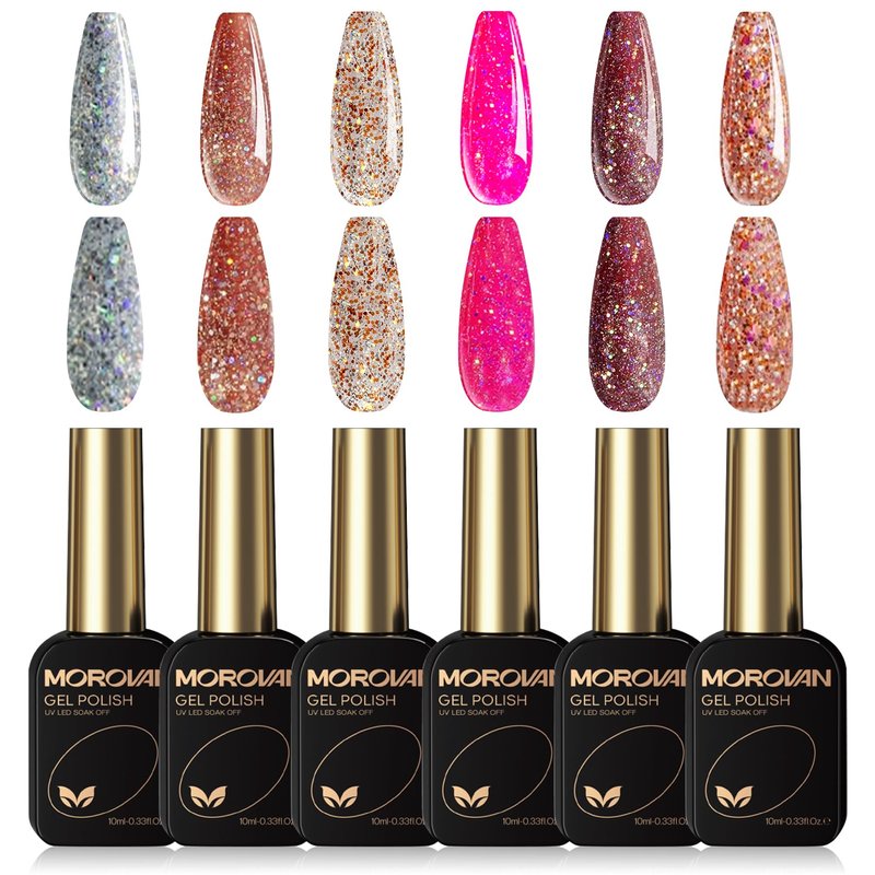 Morovan Gel Nail Polish Set: 6 Colors Glitter Gel Polish Sliver Gold Pink Nail Polish Gel Starter Kit Soak Off Curing Required Sparkle Glitter Gel Nail Polish Colors For DIY Home Salon