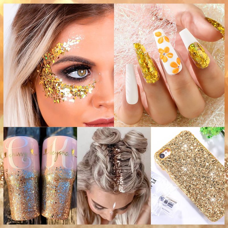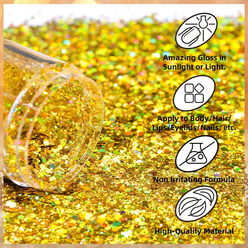 - 【Holographic Glitter】Made up of different sizes and shapes of glitter, high-brightness iridescent golden glitter makes you stand out at festivals, on stage and anywhere else you want to show off.