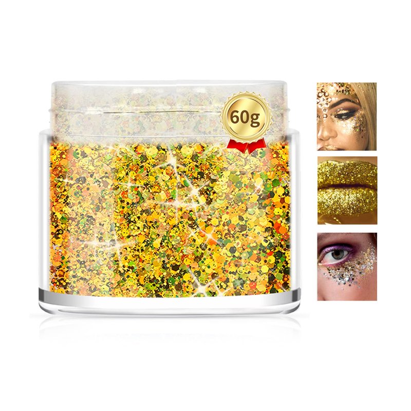 Morovan Holographic Golden Body Glitter 2oz/60g Face Glitter Hair Glitter Cosmetic Grade Chunky Glitter Makeup Festival Body Glitter Rave Glitter Eyeshadow& Lip Gloss& Resin& Nails Glitter