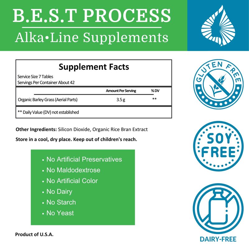 - Quality Tested for Purity — AlkaGreen Tablets contain only the highest quality organic barley grass, is never heat treated, is made in the USA & tested by GMP certified facilities.
