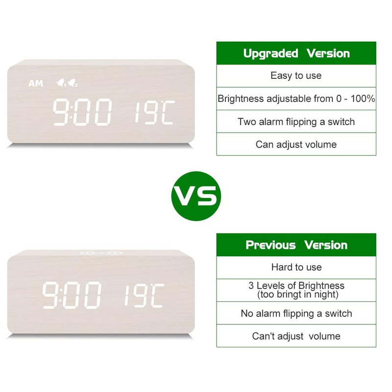 - ⏰【5 Level Brightness Adjustable alarm clock】- Compared with the alarm clocks on the market that only have three levels of brightness adjustment, this wooden alarm clock is upgraded to 5-level dimming. Customers can adjust the brightness to 5 percentile(0, 20%, 40%, 60%, 80%, 100%), which solves the problem of too bright display at night and helps you fall asleep better.