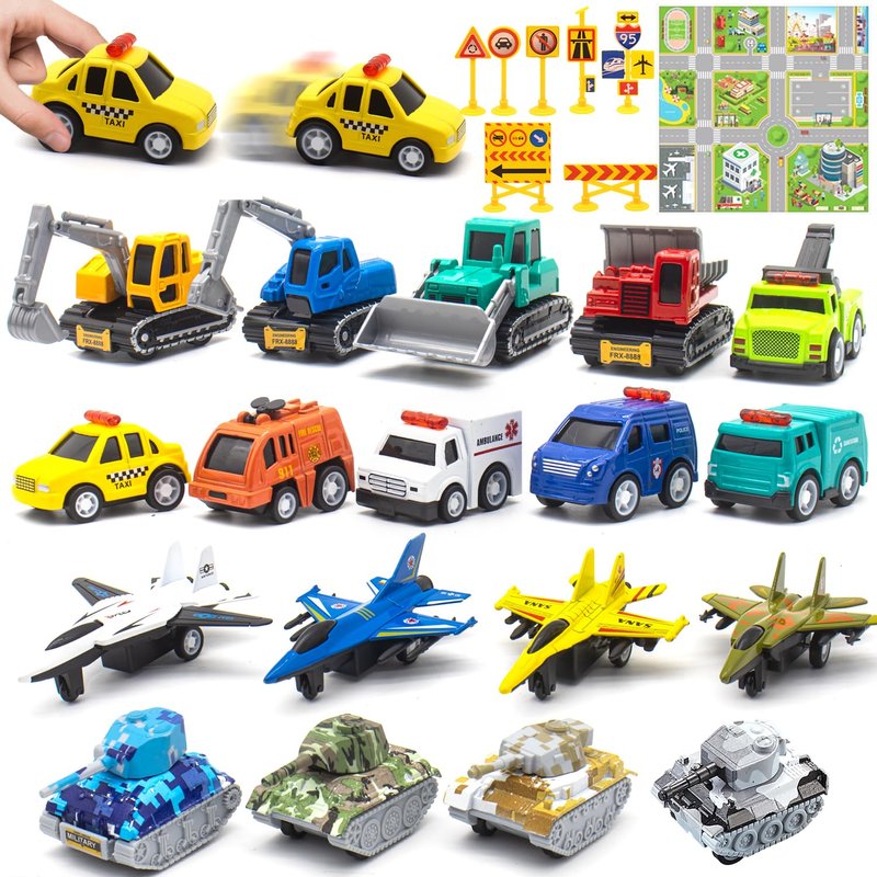 18 Pieces Pull Back City Cars: This mini pull back car set includes 6 city rescue cars, 4 construction trucks, 4 army tanks and 4 airplanes, 18 pieces in total. All of them are friction powered.