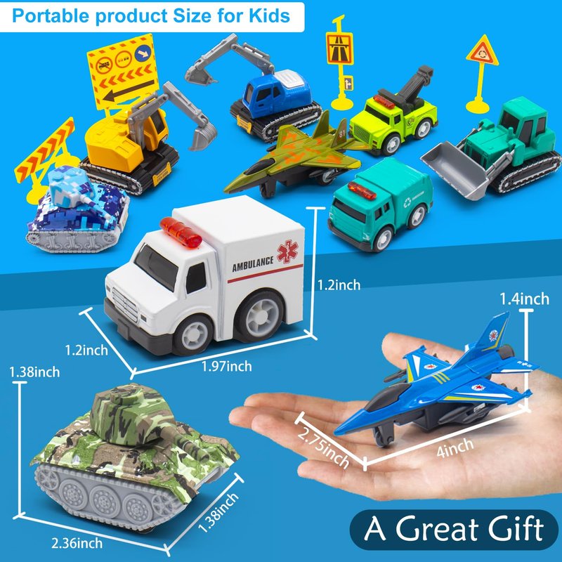 - [Super Value 18 PCS Pull Back Cars] Our friction powered model cars toy vehicles set includes a total of 18 toy vehicles: 6 city rescue cars, 4 construction trucks including 1 excavators, 1drill, 1 front loader and 1 dump truck; 4 army tanks and 4 airplanes, all of them are die cast pull back models
