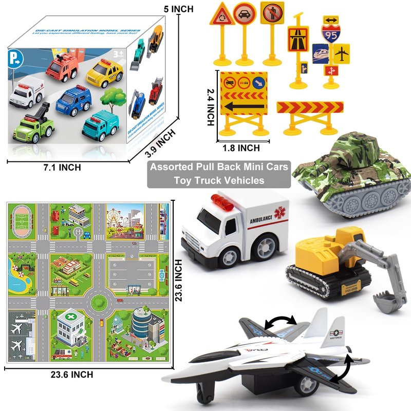 - [Great Gift & Kids Party Favor] This mini toy cars pack set comes with play mat, road signs, cones, and road blocks, which can provide much fun in different scenes. This is a great gift for party favor, cake toppers, goodie bag stuffers, decoration, school classroom prizes, children's smart learning toys, baby shower gifts, birthday parties and more