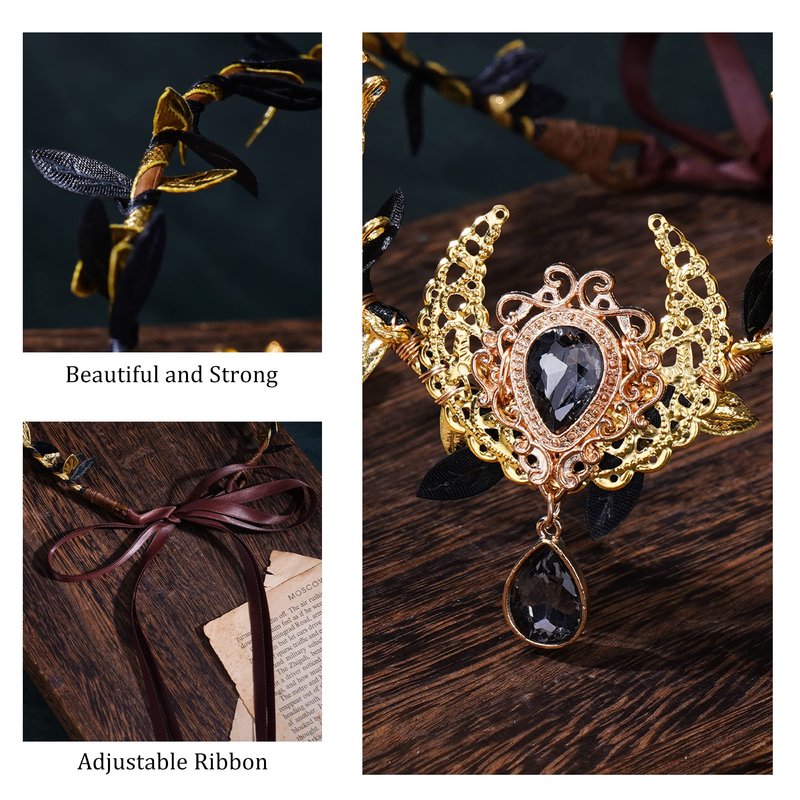 MOSTORY Handmade Black Moon Elf Crown - Woodland Fairy Headpiece Forest Flower Circlet Celtic Tiara for Women Witch Renaissance Halloween Cosplay Costumes