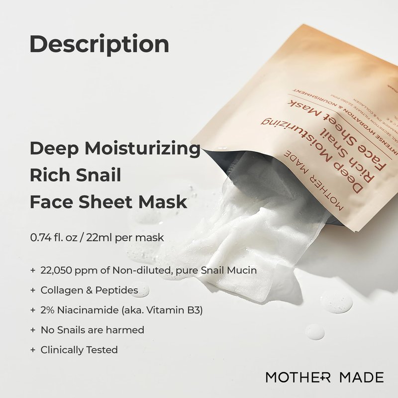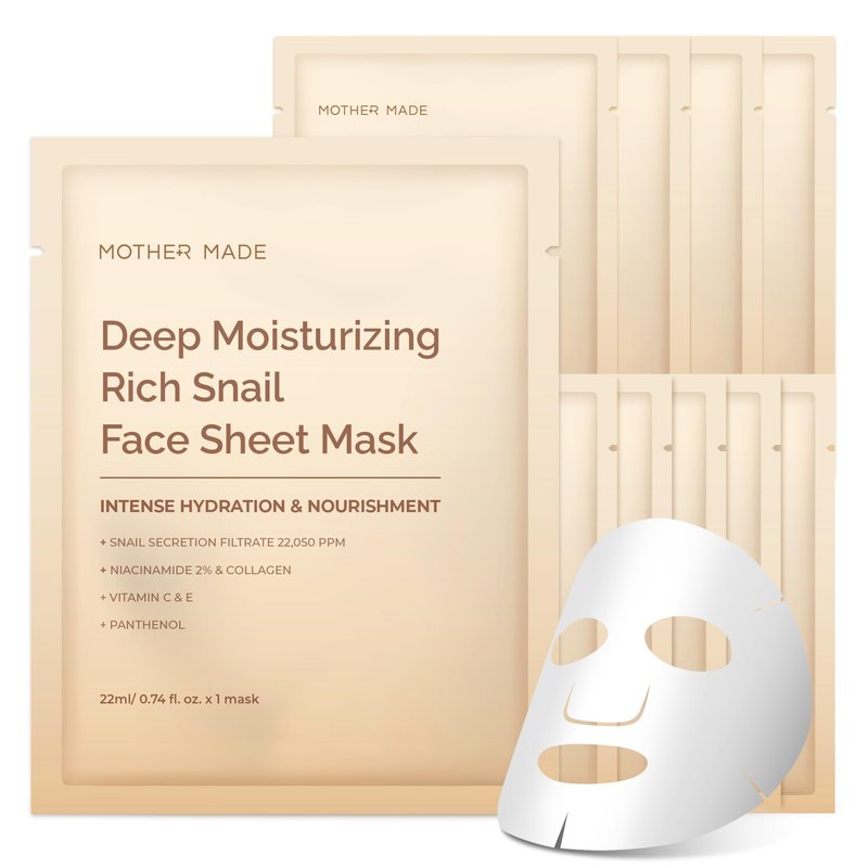 MOTHER MADE Moisturizing Snail Mucin Face Mask 10 Sheets, 22,050ppm Snail Secretion Filtrate, Collagen, Niacinamide, Vitamin C & E, Anti-aging Snail Essence for Dry, Sensitive Skin, Korean Skincare