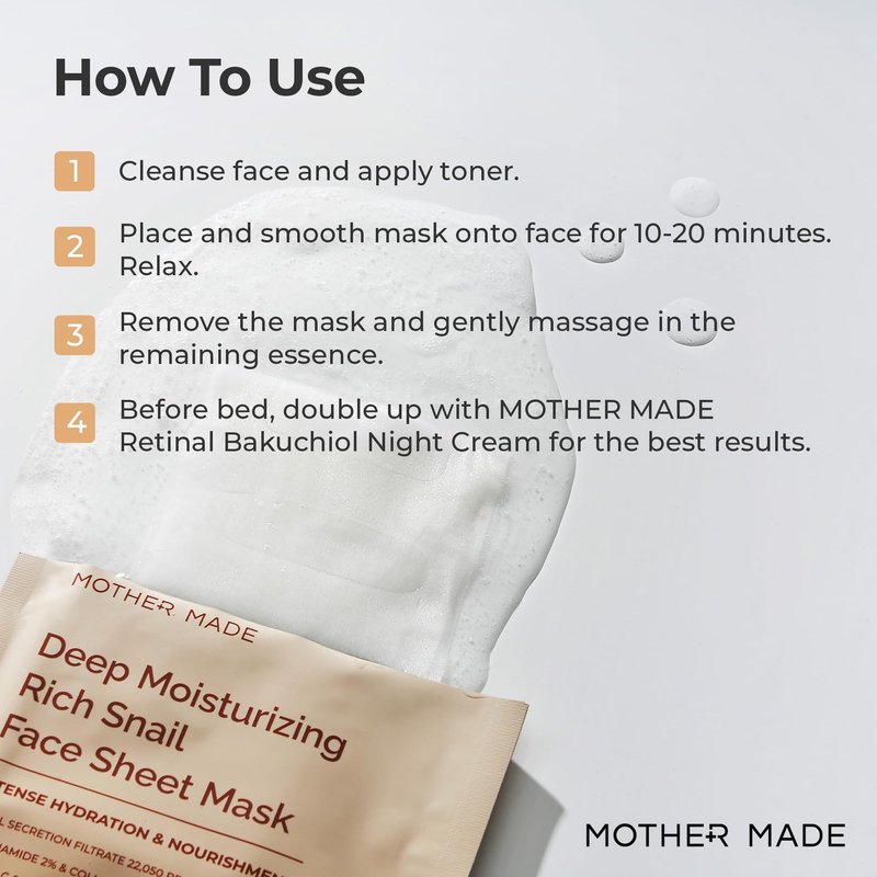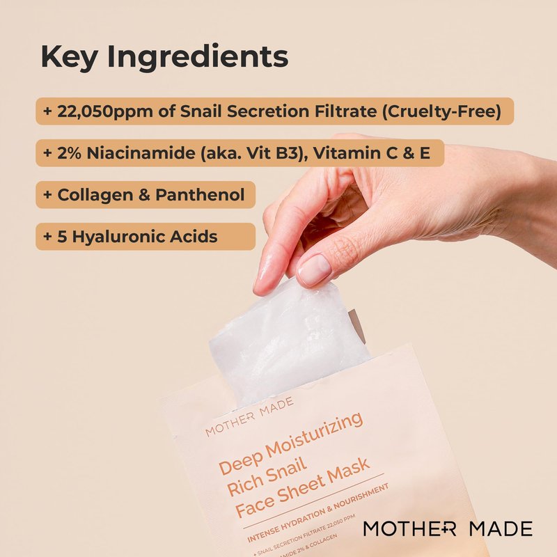 - NO SNAILS ARE HARMED - Snail Secretion filtrate contained in the mask is collected and processed in a safe and environmentally friendly way that NO snails being harmed or stressed during the collection process; MOTHER MADE is cruelty-free!