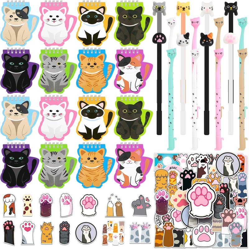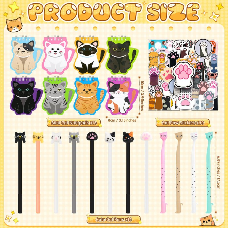 - Cat Party Favors Bulk: you will get 16 mini notepads in 8 styles, 16 cat pens in 12 styles, 50 cute cat stickers, totally 82 pieces; Designed with a cat theme to add color to the party, sufficient to meet your various needs and expectations