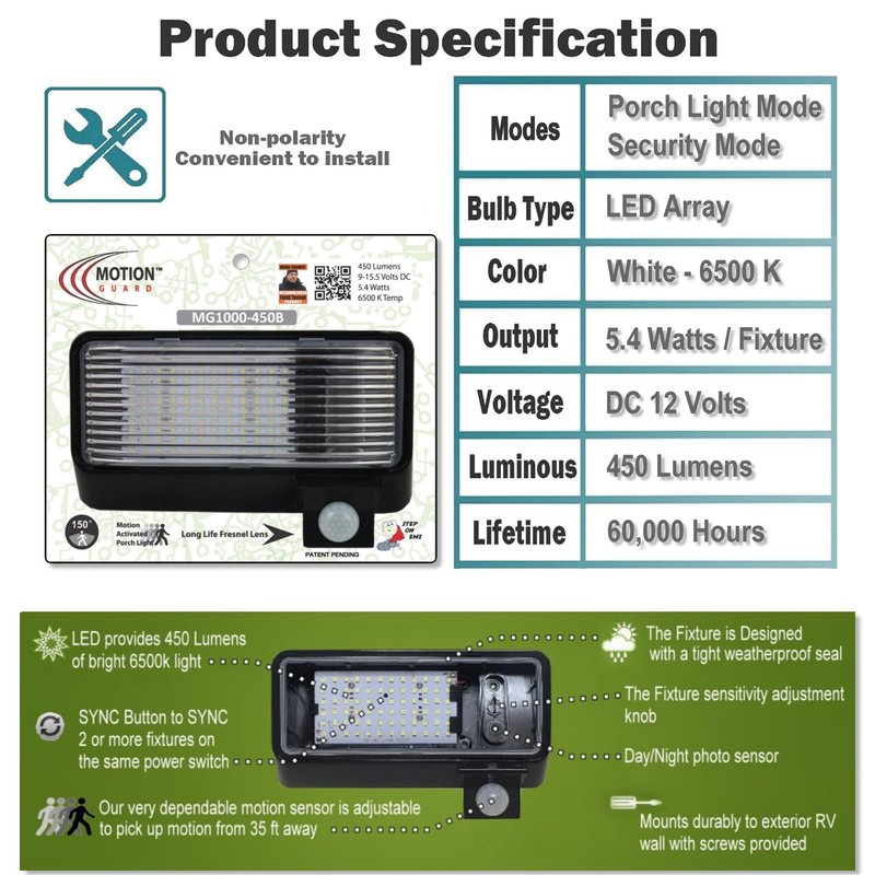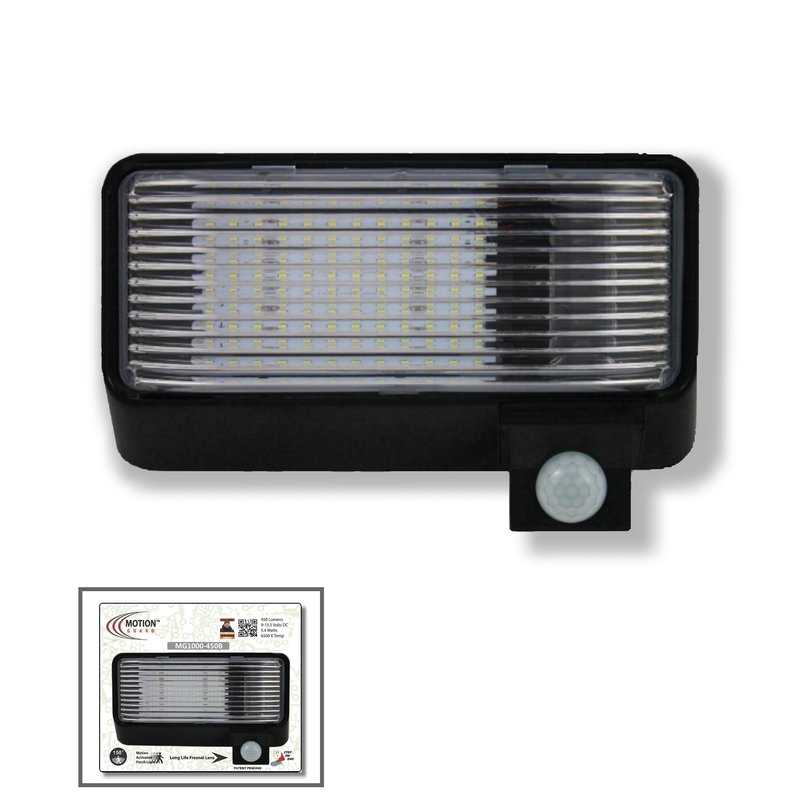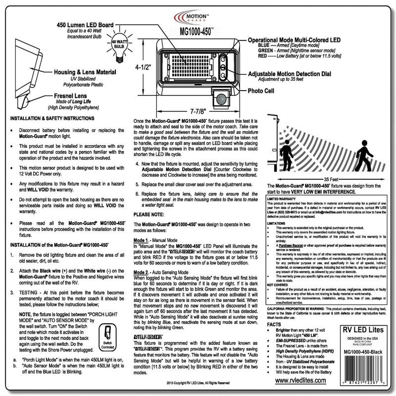 The MG1000-450B is a Functional RV Outdoor LED Floodlight with Motion Sensor. Has Integrated long-life 450LM LED Array (Equal to a 40-Watt Light Bulb) in an affordable, energy saving security lighting solution. Provides maintenance-free general and security illumination for RV outdoor use applications. Bright, uniform illumination is ideal for camping areas and egress easements creating an inviting exterior space as well as providing safety and security when camping in unfamiliar locations. The MG1000-450 with the built-in photo sensor, will arm and disarm automatically while in Motion Mode. One of the most defining features of the MG1000-450 is that it is EMI Suppressed so as not to affect your “TV or Radio Reception”. The fixture has “Polarity Guard” to ease the difficulty of the installation by correcting the Polarity in the RV automatically. The fixture has “INTELA-SENSOR” that alerts when the coach battery is at or below 11.5 Volts by blinking a "RED LED" - NOTE (This Fixture is powered by the Coach Battery). Features: Two modes of operation, [Porch Light Mode] & [Motion Activated Light Mode] “Polarity Guard” equipped to simplify the installation “INTELA-SENSOR”– alerts when the battery is at or below 11.5 Volts 450LM LED Array (Equal to a 40 Watt Light Bulb) Rugged UV Stabilized Polycarbonate Black Housing Clear UV Stabilized Polycarbonate lens is fully gasketed to keep out moisture, dirt and bugs Fresnel Lens made from High-Density Polyethylene (HDPE) to give long life Operational Voltage, 12 Volts DC .45 Amp Draw Watts, 5.4 Single array motion sensor provides 150° detection with up to 35 feet forward range Sensitivity adjustable knob provides precision control Designed for wall & ceiling mounting Wet Location Guaranteed for one year against mechanical defects-Specifications: Length: 7.875 inches Width: 4.5 inches Height: 2.125 inches Bulb Type: LED Voltage: 12DC. Patented