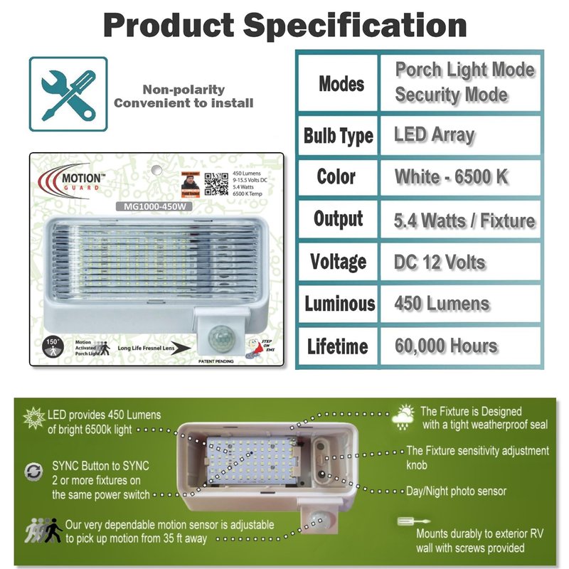 The MG1000-450W is a Functional RV Outdoor LED Floodlight with Motion Sensor. Has Integrated long-life 450LM LED Array (Equal to a 40-Watt Light Bulb) in an affordable, energy saving security lighting solution. Provides maintenance-free general and security illumination for RV outdoor use applications. Bright, uniform illumination is ideal for camping areas and egress easements creating an inviting exterior space as well as providing safety and security when camping in unfamiliar locations. The MG1000-450 with the built-in photo sensor, will arm and disarm automatically while in Motion Mode. One of the most defining features of the MG1000-450 is that it is EMI Suppressed so as not to affect your “TV or Radio Reception”. The fixture has “Polarity Guard” to ease the difficulty of the installation by correcting the Polarity in the RV automatically. The fixture has “INTELA-SENSOR” that alerts when the coach battery is at or below 11.5 Volts by blinking a "RED LED" - NOTE (This Fixture is powered by the Coach Battery). Features: Two modes of operation, [Porch Light Mode] & [Motion Activated Light Mode] “Polarity Guard” equipped to simplify the installation “INTELA-SENSOR”– alerts when the battery is at or below 11.5 Volts 450LM LED Array (Equal to a 40 Watt Light Bulb) Rugged UV Stabilized Polycarbonate White Housing Clear UV Stabilized Polycarbonate lens is fully gasketed to keep out moisture, dirt and bugs Fresnel Lens made from High-Density Polyethylene (HDPE) to give long life Operational Voltage, 12 Volts DC .45 Amp Draw Watts, 5.4 Single array motion sensor provides 150° detection with up to 35 feet forward range Sensitivity adjustable knob provides precision control Designed for wall & ceiling mounting Wet Location Guaranteed for one year against mechanical defects-Specifications: Length: 7.875 inches Width: 4.5 inches Height: 2.125 inches Bulb Type: LED Voltage: 12DC. Patented
