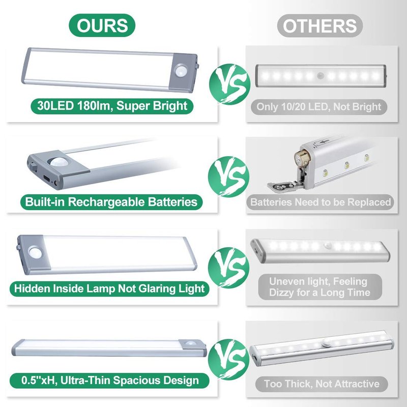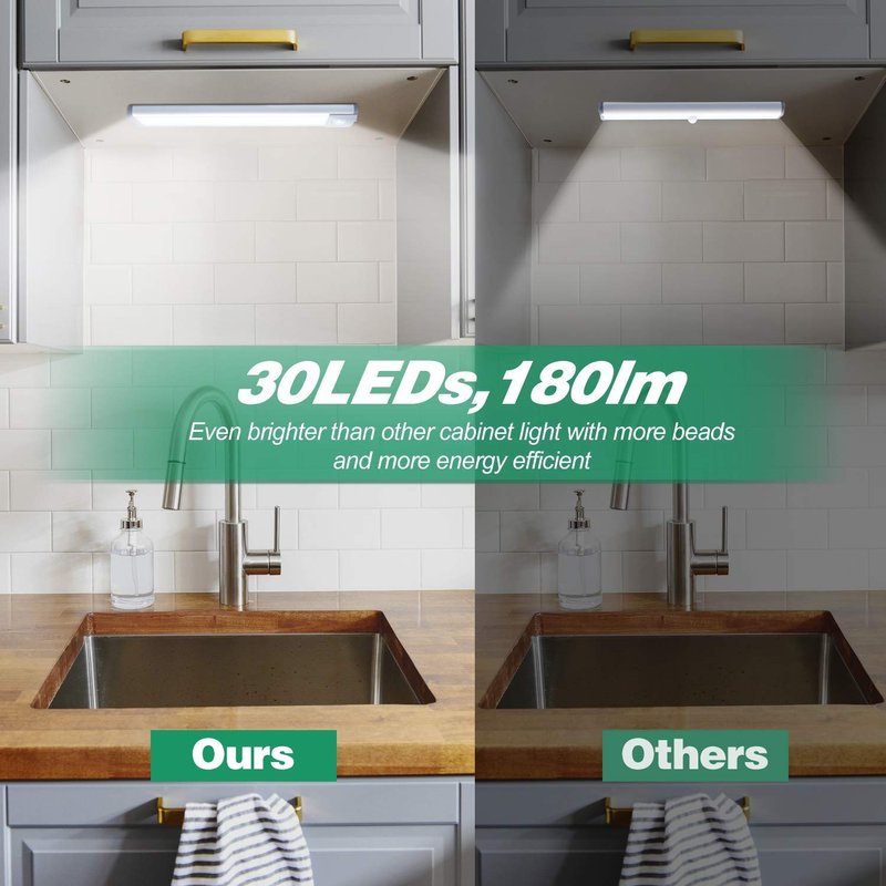 -More Brightness: With 30 LEDs, up to 180 lumens, even brighter than other counter lights of the 10/20 LEDs.