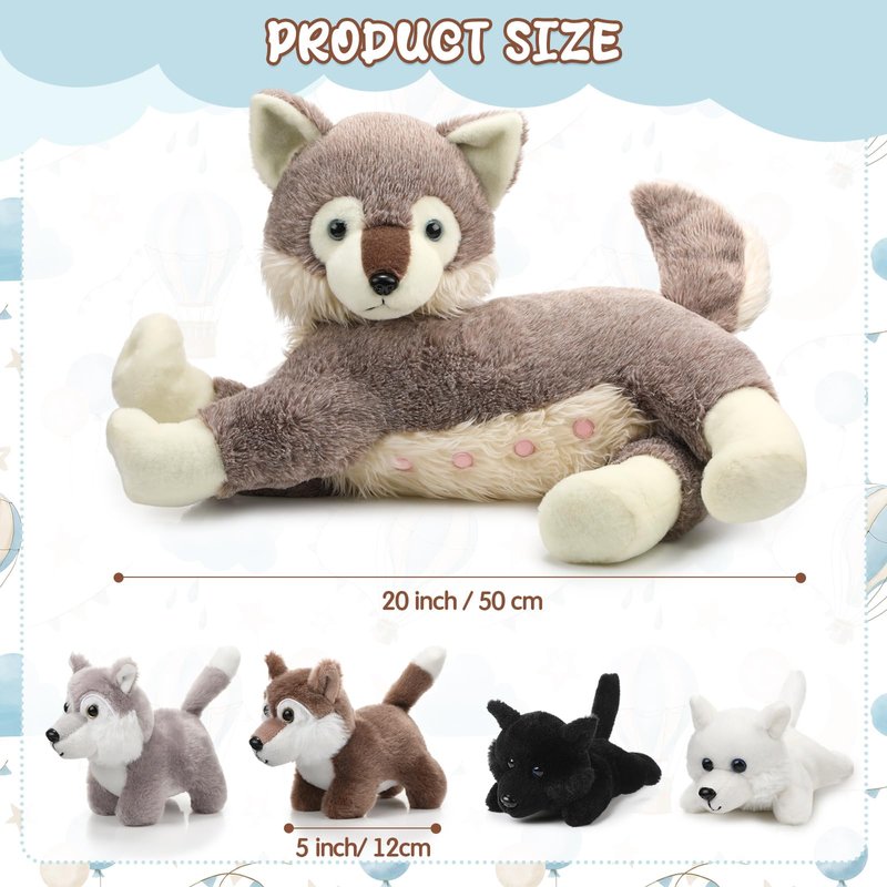 - 5 In 1 Plush Toy Wolf: you will get 5 pieces of wolf stuffed animals, including 1 big wolf mom (approximately 20 inches/ 50 cm in length) and 4 baby wolf stuffed animals (approximately 5 inches/ 12 cm in size), and the 4 stuffed baby wolves can be taken out through the zipper opening on mommy's back; The soft fur, sparkling eyes and lifelike faces will attract kids' attention and make kids unable to put it down with the wolf family stuffed animals set